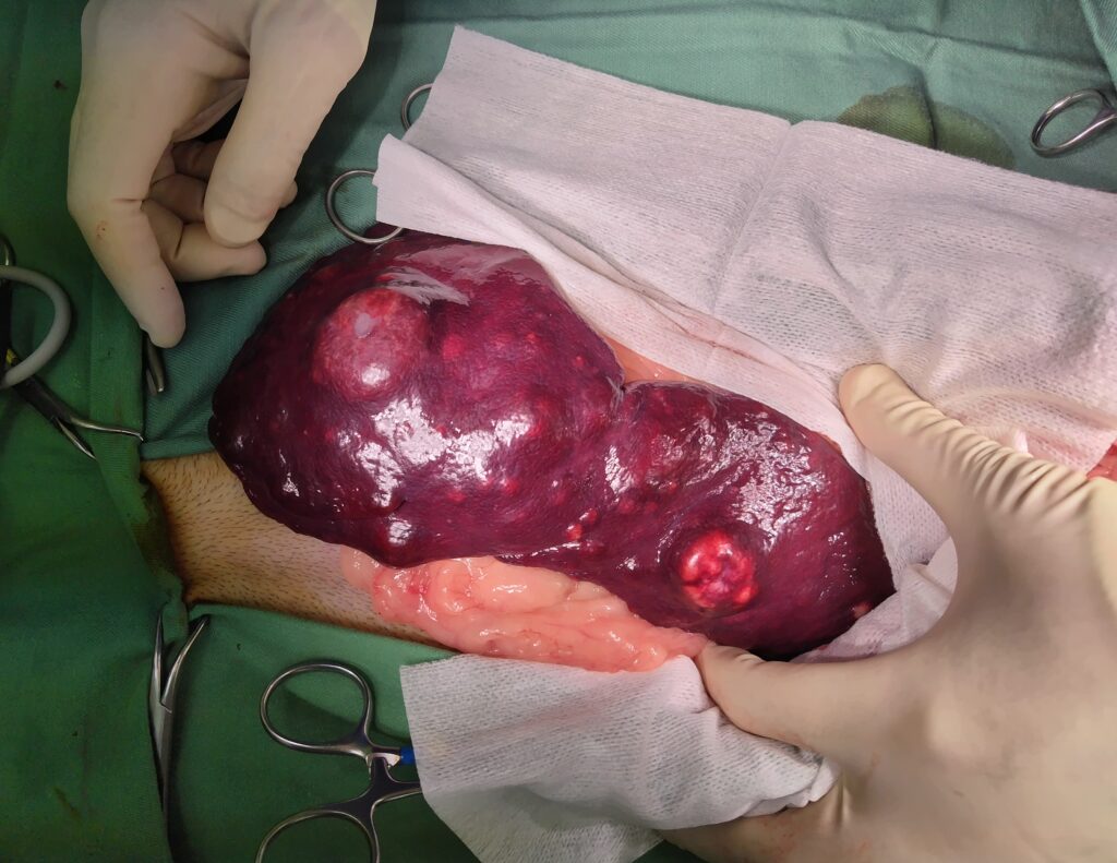 超音波検査で脾臓に大きな腫瘍が認められた為、当日に摘出手術を行いました。