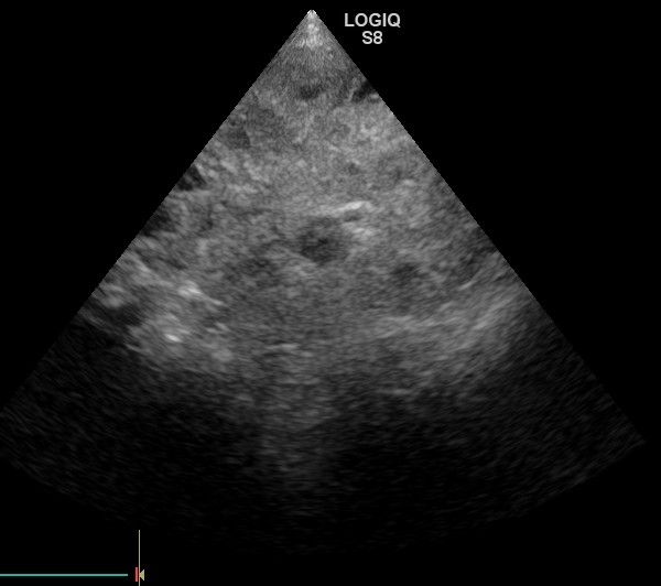 その際最近散歩にあまり行きたがらないとの主訴があり、お腹を触診したところ10cm大の腫瘤が触知された為、急遽超音波検査を行いました。